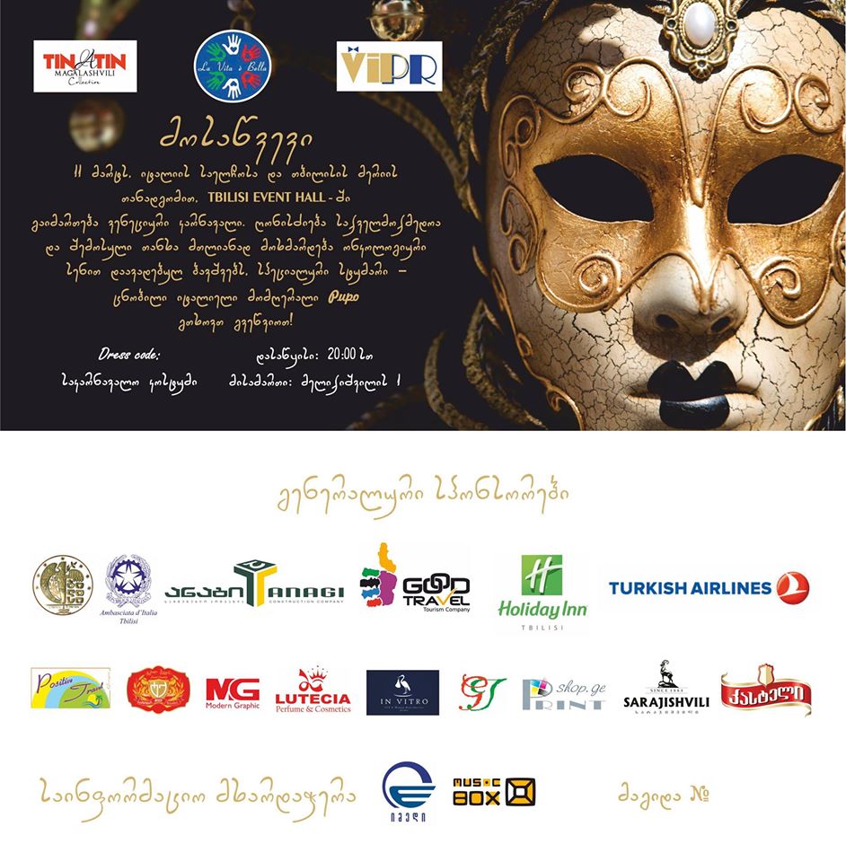 საქველმოქმედო ღონისძიება - „ვენეციური კარნავალი„ გახორციელდა; კომპანია „ VIPR` `( ტრენინგისა და ღონისძიებათა მართვის ცენტრი/მალტის წარმომადგენლობა), საქველმოქმედო ორგანიზაცია „ცხოვრება მშვენიერია„, მოდის სახლი „თინათინ მაღალაშვილის„ ორგანიზებით . . იდეის ავტორი - ნიკა ესაკიაჩვენ ვეხმარებით ბერი ანდრიას ფონდს - ბავშვებს